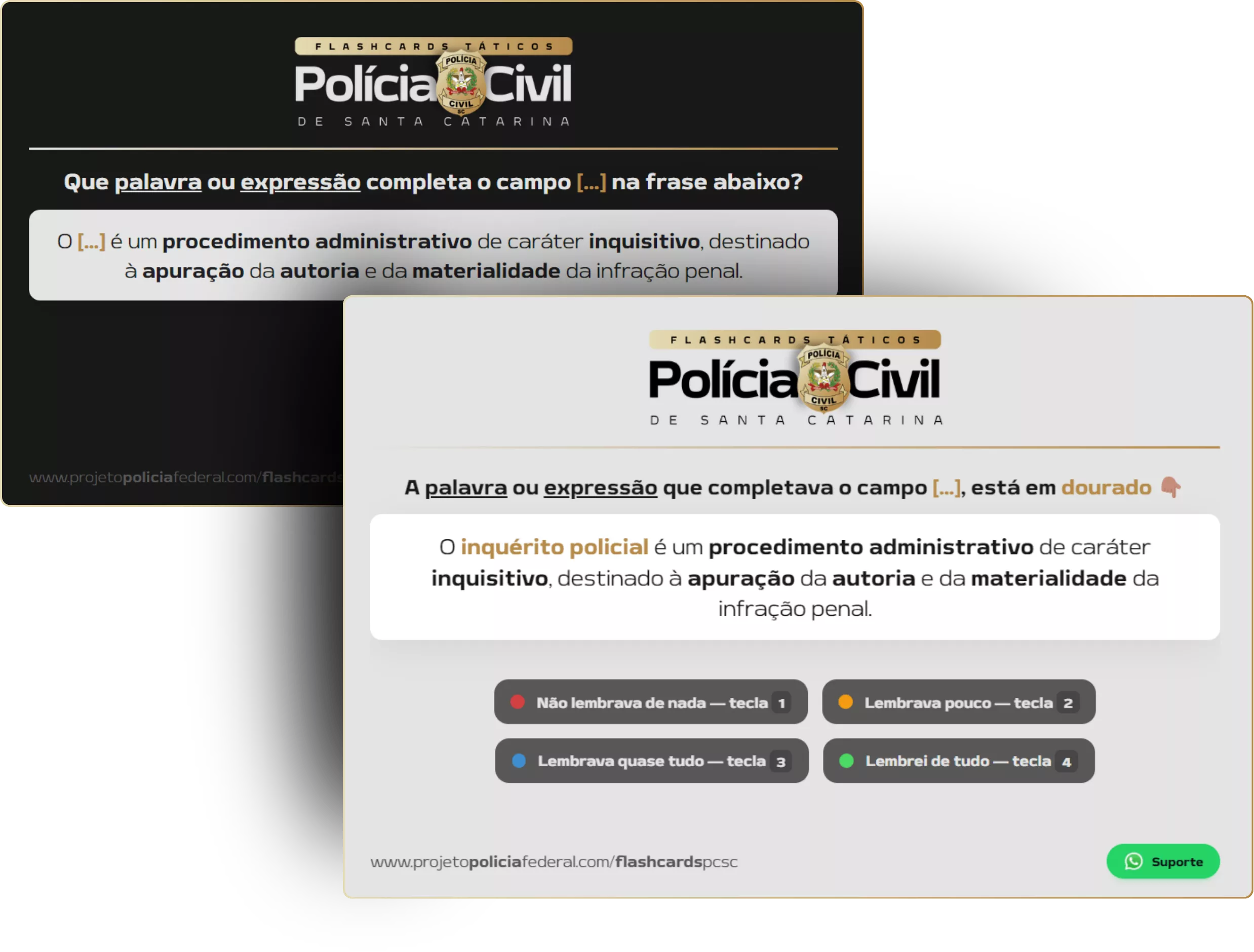 Com nossos Flashcards Táticos da PCSC, você terá acesso a Flashcards completos de todas as matérias e tópicos do edital, organizados por cada item do edital para facilitar a organização do que já estudou.